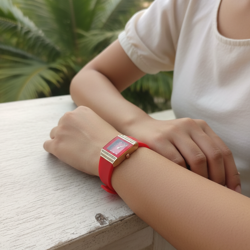Enhance Your Style With The Luxury Women’s Diamond Quartz Watch, Designed For Elegance And Everyday Wear. Featuring A Beautiful Square Dial Decorated With Sparkling Crystal Stones, This Watch Combines Sophistication And Modern Design. The High-Quality Quartz Movement Ensures Accurate Timekeeping, While The Soft Silicone Strap Offers Comfort And Durability. Perfect For Casual, Party, Or Formal Occasions, This Watch Adds A Touch Of Glamour To Any Outfit. Available In Multiple Attractive Colors, It’s A Perfect Blend Of Fashion And Function For Modern Women.